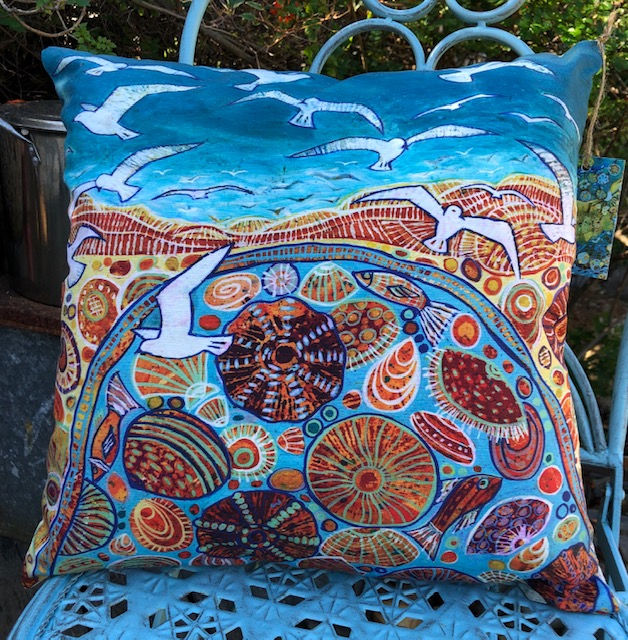 Janeens original Artworks have been reproduced onto 100% linen cotton/cotton canvas then professionally handmade into stunning cushion covers and pouches in Geraldton Western Australia by 3 Funky Lizards Embroidery and Ridgy didge Designs W.A. All pouches are padded and lined with 100% cotton and high a quality brass look zips. All cushions have 100% cream cotton backing with high quality hidden zip.